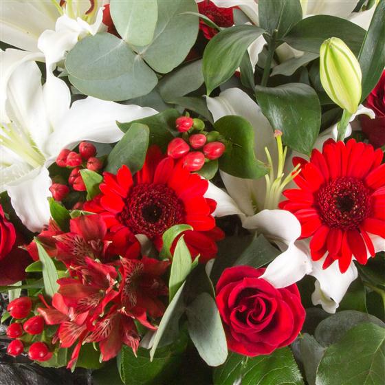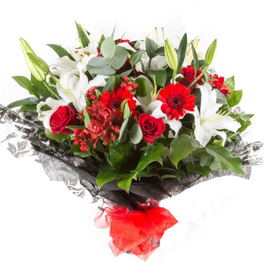 A highly scented hand-tied bouquet of oriental white lilies, berries, roses and scarlet red gerbera.